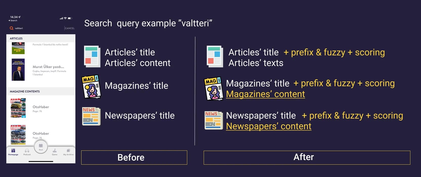 Understanding the existing user search behavior was essential. Users could search article titles, magazine/newspaper names, and article text. However, the limitations were significant: lack of prefix and fuzzy search directly hampered usability. Even minor typos resulted in zero results, effectively locking users out from relevant content and creating a negative user experience that impacted product satisfaction.