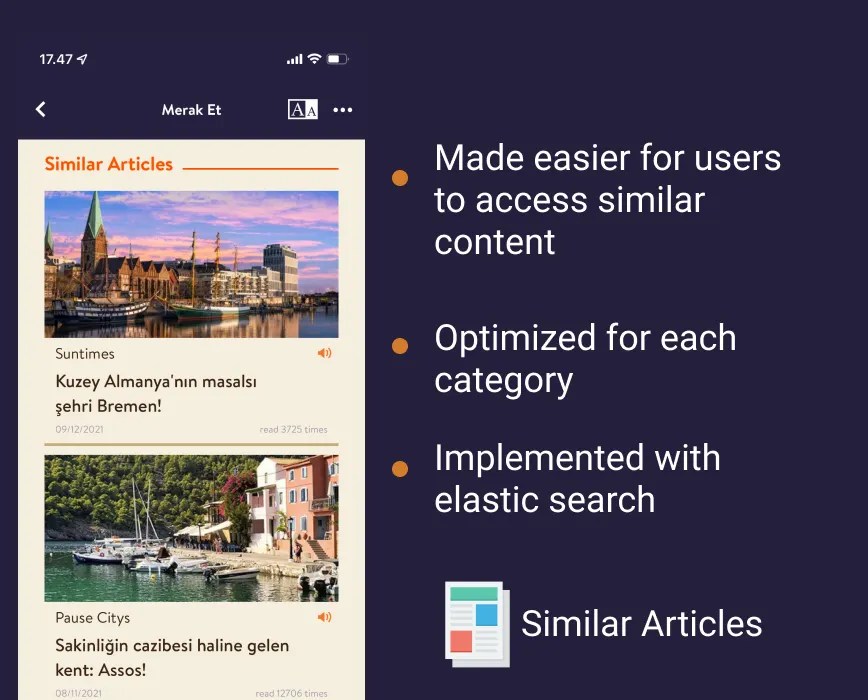 Finally, and importantly for long-term user engagement, we launched “Similar Articles.” This feature went beyond basic search, proactively promoting content discovery and personalized user journeys. By providing recommendations based on reading habits, “Similar Articles” fostered deeper exploration and increased time spent within the Dergilik platform. This feature directly supported our goals of increased user engagement and content consumption.